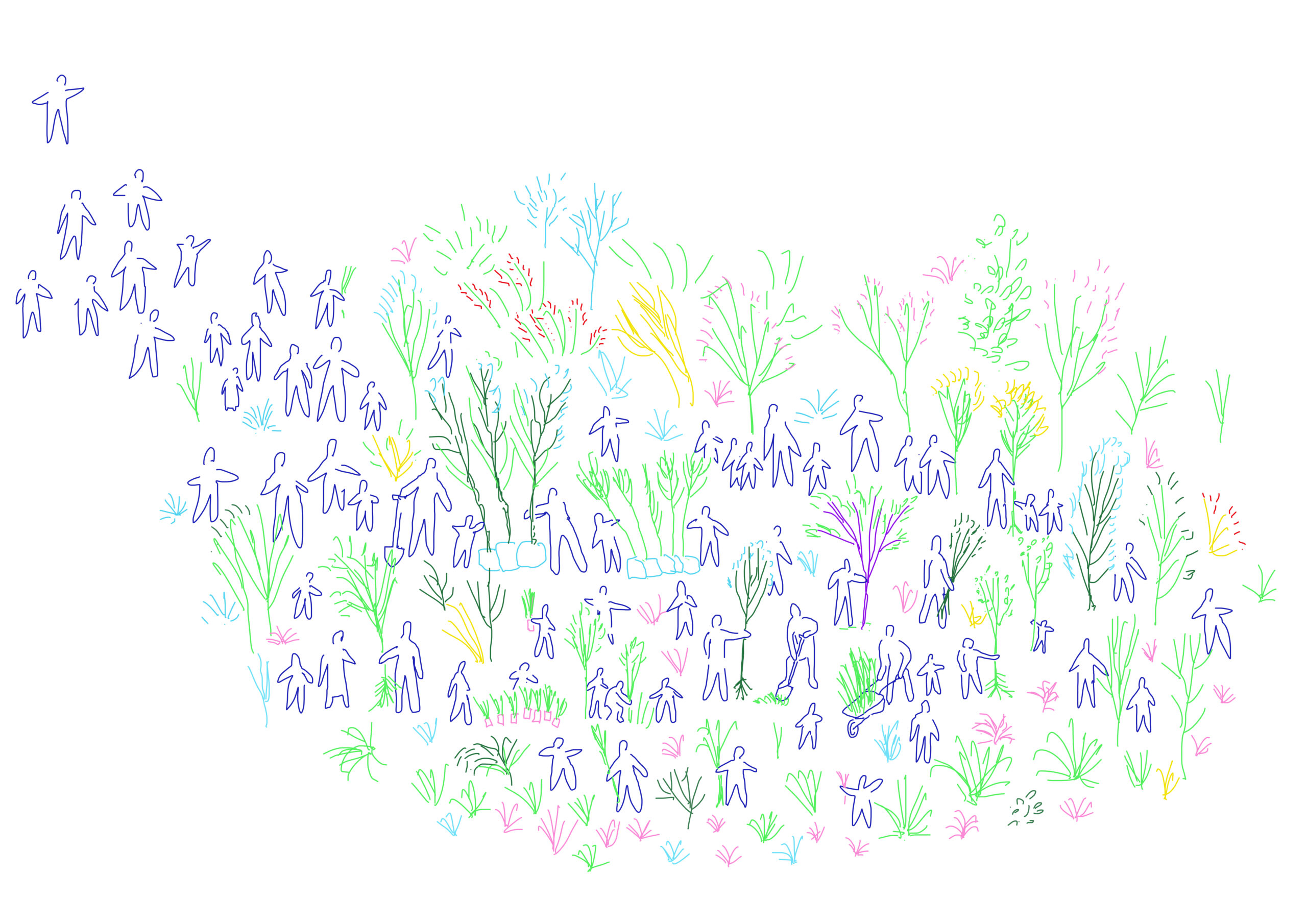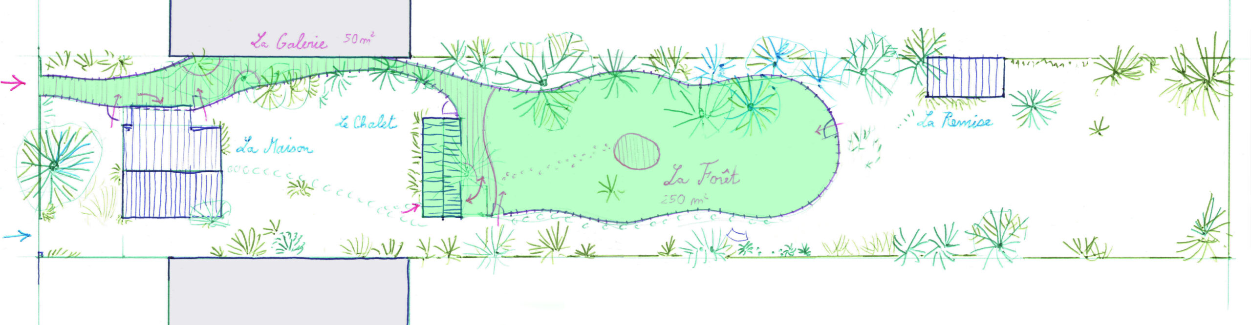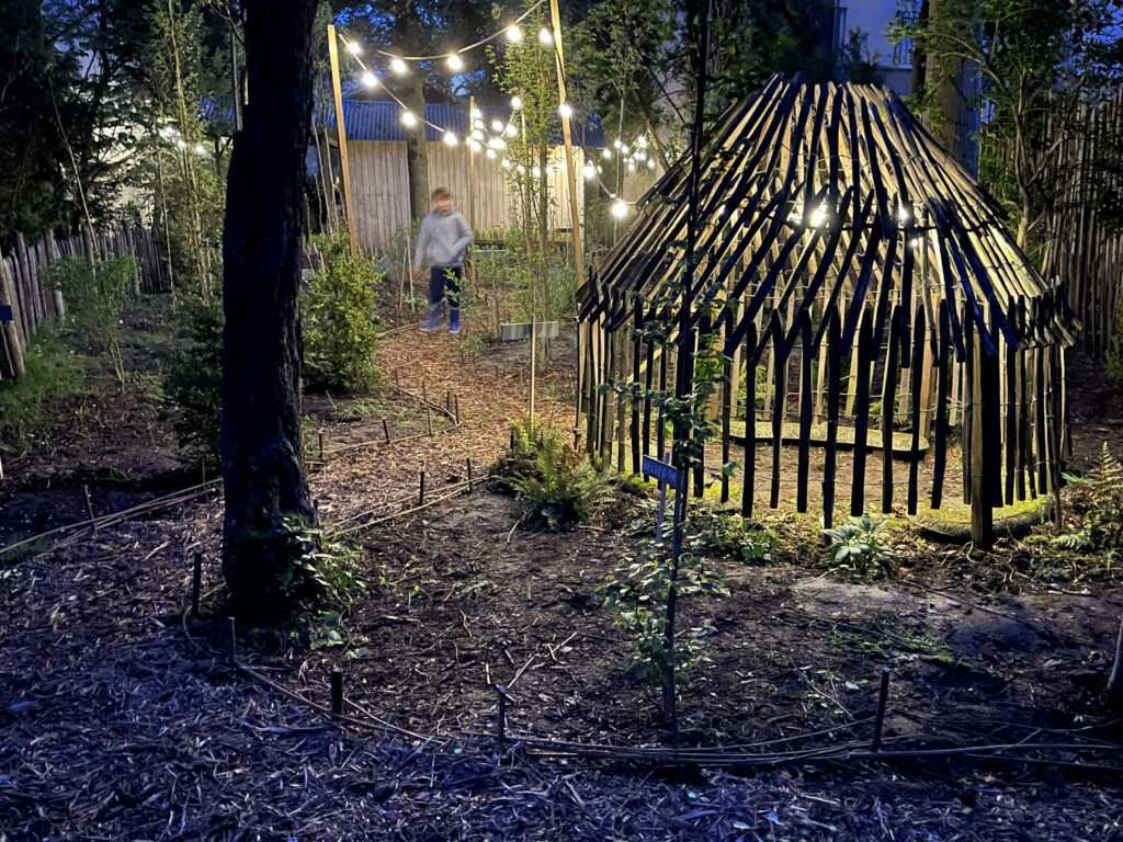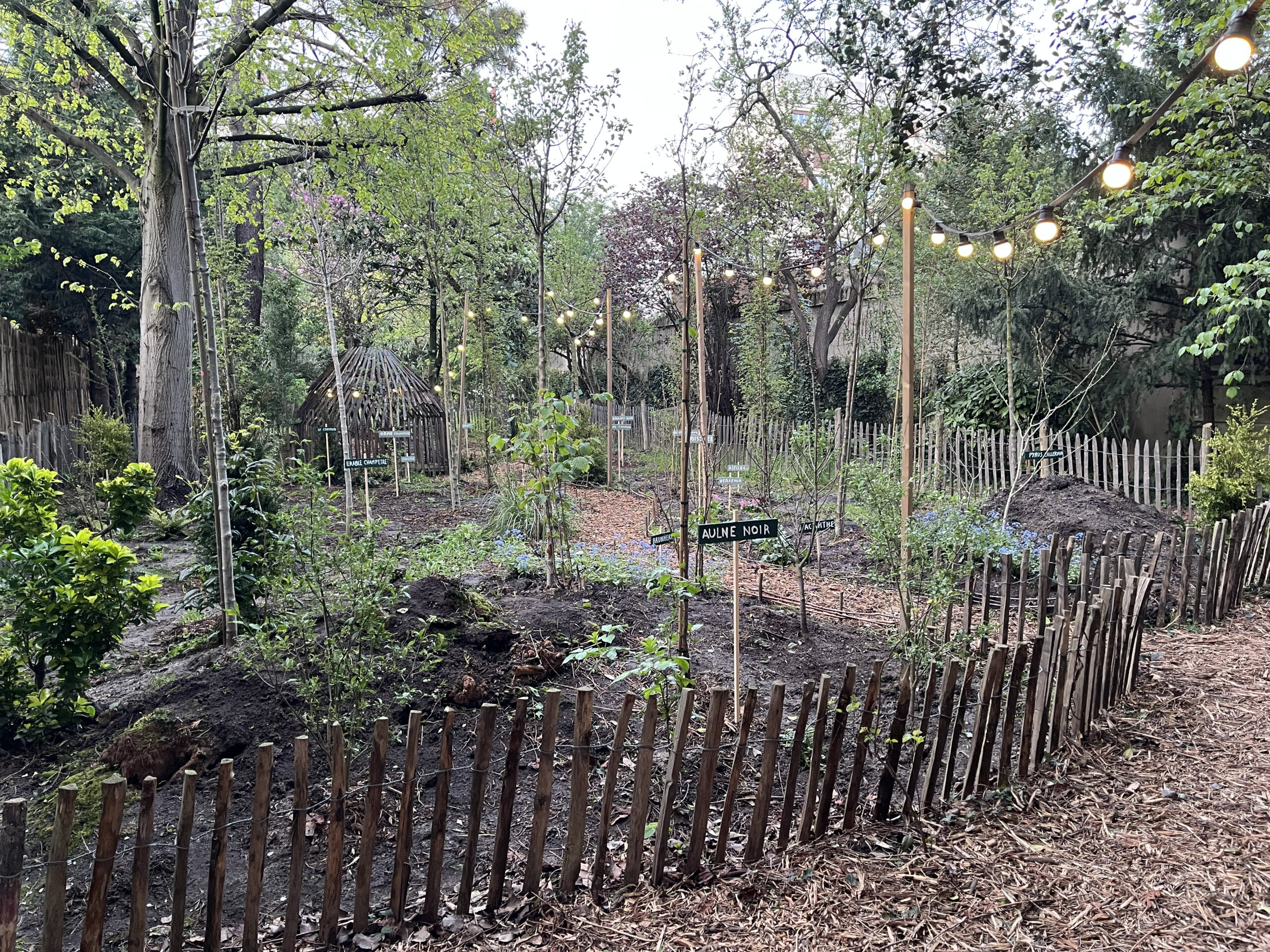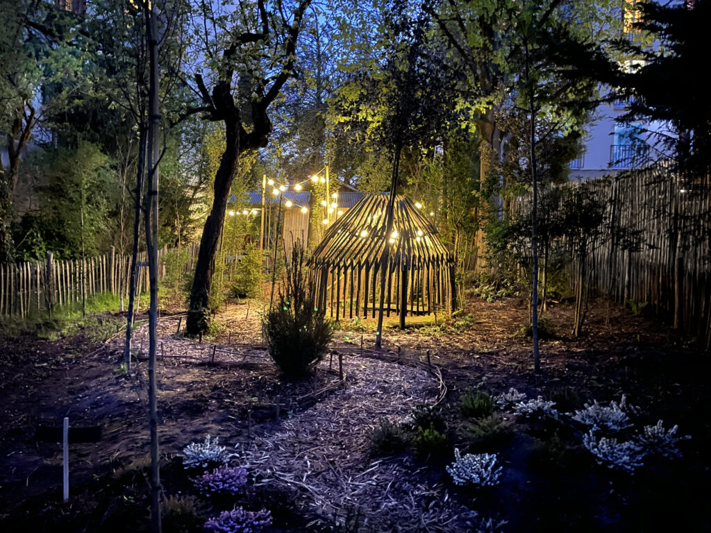 Les aménagements du site, les accès, les cheminement, l’enceinte du boisement, la treille, la cabane-observatoire et le jardin vertical sont dessinés et construits en ganivelles de châtaigniers et soulignés par des guirlandes lumineuses et une signalétique peinte. Ces dispositifs permettent une ouverture du site aux écoles et à tout autre public.
